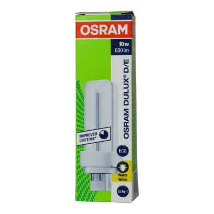 The Osram Dulux D can be used in combination with a conventional ballast. The lamp has a short and compact lamp base type G24q-1. This means that each of these compact fluorescent lamps has a base with 2 pins. The lamps Osram Dulux D/E 10W 830 has a length of 103 mm.